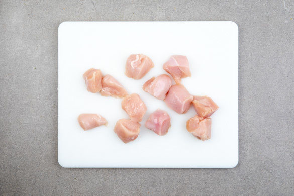 Das Fleisch mit etwas Küchenkrepp trocken tupfen und in 3–4cm große Stücke schneiden.