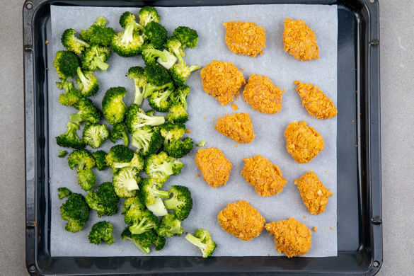Die Hähnchenstücke nacheinander in der Stärke, im Ei und in den Cornflakes wenden. Die Nuggets neben dem Brokkoli auf dem Blech verteilen und beides 15–20Min. im Ofen backen, bis der Brokkoli gar und das Fleisch in der Mitte durch ist.