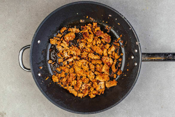 Das Hackfleisch in einer großen Pfanne mit 2EL Pflanzenöl bei starker Hitze 3–5Min. krümelig anbraten. In der Zwischenzeit den Knoblauch schälen und durch eine Knoblauchpresse drücken oder sehr fein würfeln. In der letzten Minute den Knoblauch und je ½TL Salz und Pfeffer unterrühren, dann mit der restlichen Sojasauce ablöschen und vom Herd nehmen.