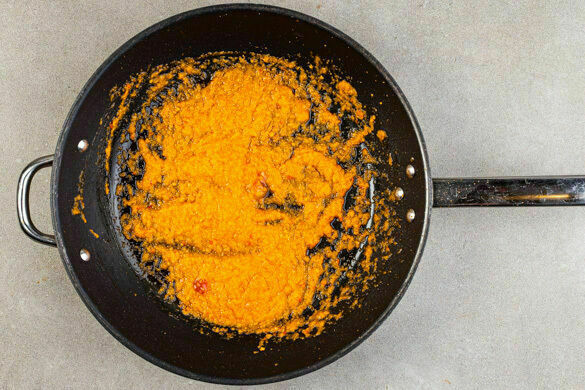 In einem mittelgroßen Topf 800ml leicht gesalzenes Wasser für den Reis zum Kochen bringen. Die Currypaste und das Tomatenmark in einer großen Pfanne oder einem Wok mit 3EL Pflanzenöl bei mittlerer Hitze ca. 5Min. sanft anbraten.