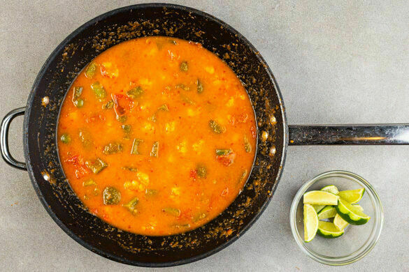 Die Garnelen in einem Sieb mit kaltem Wasser abspülen und mit etwas Küchenkrepp trocken tupfen, in die Pfanne zu dem Curry geben und in ca. 3Min. gar köcheln. Inzwischen die Limetten in Spalten schneiden.