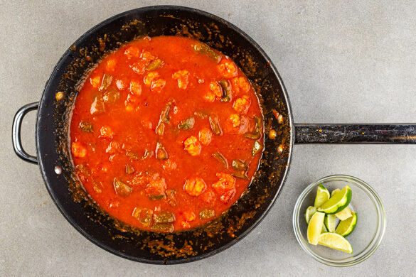 Die Garnelen in einem Sieb mit kaltem Wasser abspülen und mit etwas Küchenkrepp trocken tupfen, in die Pfanne zu dem Curry geben und in ca. 3Min. gar köcheln. Inzwischen die Limette in Spalten schneiden.