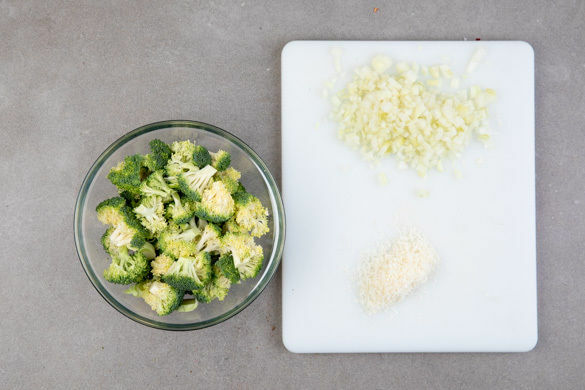 Den Brokkoli in kleine Röschen schneiden. Die Zwiebel schälen, halbieren und fein würfeln. Den Käse fein reiben.