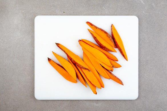 Den Backofen auf 220°C Umluft (240°C Ober-/Unterhitze) vorheizen. Die Süßkartoffeln nach Belieben schälen, dann längs halbieren und in 0,5–1cm dünne, pommesartige Stifte schneiden.