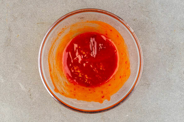 Die ½ der Chilipaste, 1 Prise Salz, ½EL Zucker, 2EL Ketchup, 1EL Essig und 2EL Wasser zu einer Glasur verrühren. Mit Salz abschmecken und für mehr Schärfe ggf. mehr Chilipaste hinzugeben.