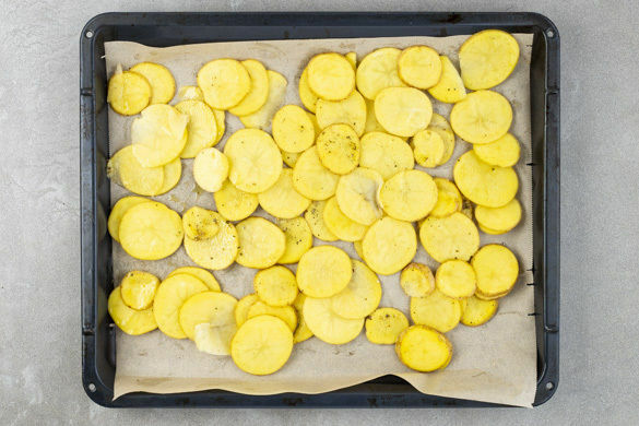 Den Backofen auf 240°C (220°C Umluft) vorheizen. Die Kartoffeln samt Schale in ca. 0,5cm dünne Scheiben schneiden. Mit 1EL Olivenöl, ca. 1EL Gewürzmischung und 1 Prise Salz vermengen.