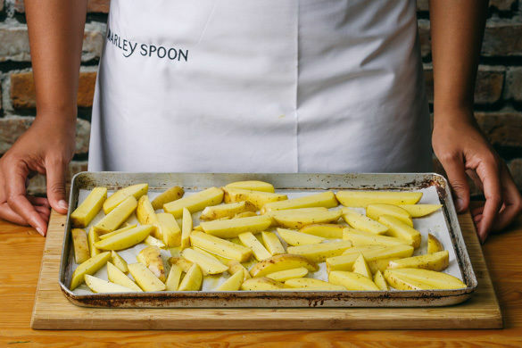 Den Backofen auf 240°C (220°C Umluft) vorheizen. Die Kartoffeln samt Schale in 1–2cm dünne, pommesartige Stifte schneiden, mit 1EL Olivenöl vermengen, auf einem mit Backpapier ausgelegten Backblech verteilen und im Ofen 20–25Min. goldbraun rösten.