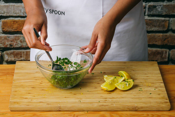 Die Petersilie samt Stängeln fein hacken. Den Knoblauch schälen und sehr fein würfeln oder durch eine Knoblauchpresse drücken. Die Zitronenschale fein abreiben und mit der Petersilie, dem Knoblauch und 5EL Olivenöl mischen, mit Salz und Pfeffer abschmecken. Die abgeriebene Zitrone in Spalten schneiden.
