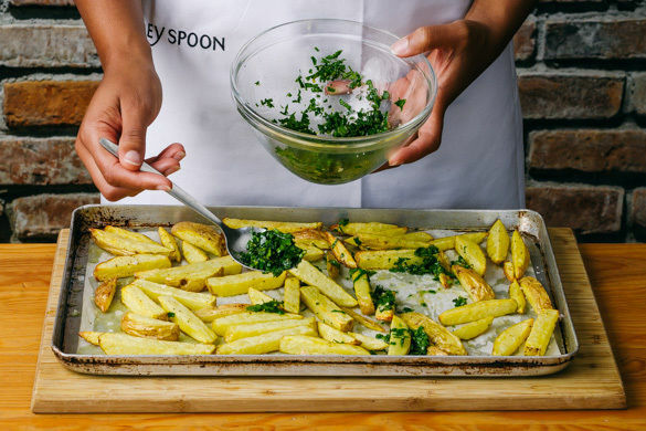 Den Backofen auf 240°C (220°C Umluft) vorheizen. Die Kartoffeln samt Schale in 1–2cm dünne, pommesartige Stifte schneiden, mit 2EL Olivenöl vermengen, auf einem mit Backpapier ausgelegten Backblech verteilen und im Ofen 20–25Min. goldbraun rösten.