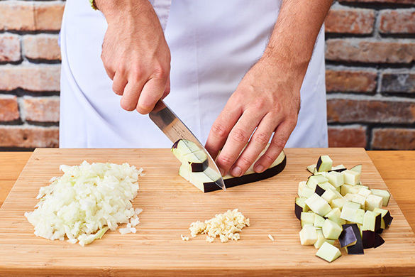 In einem großen Topf ausreichend gesalzenes Wasser für die Pasta zum Kochen bringen. Inzwischen die Zwiebeln und den Knoblauch schälen und in feine Würfel schneiden. Die Aubergine in 1–2cm große Würfel schneiden.