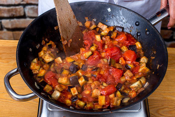 Die Auberginen in einer großen Pfanne mit 4EL Olivenöl bei mittlerer Hitze 3–5Min. anbraten. Die Zwiebeln und den Knoblauch hinzugeben und 6–8Min. mitbraten.