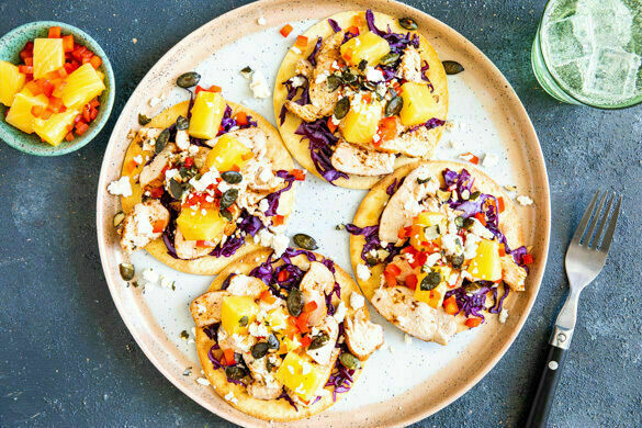 Den Feta mit den Fingern oder einer Gabel zerkrümeln. Die Paprika vierteln, entkernen und fein würfeln, dann mit der restlichen Ananas, 2EL hellem Essig und 1TL Zucker vermengen. Die Tostadas nach Belieben mit dem Rotkohl, dem Fleisch, der Salsa und dem Feta belegen und mit den Kürbiskernen garniert servieren.
