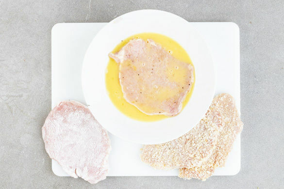 1 Ei auf einem tiefen Teller verquirlen. Auf einem zweiten Teller 3EL Mehl, auf einem dritten Teller das Panko-Paniermehl bereitstellen. Das Fleisch trocken tupfen, mit einem Fleischklopfer oder einer schweren Pfanne ca. 0,5cm dünn plattieren und halbieren. Mit Salz und Pfeffer würzen und nacheinander im Mehl, dem verquirlten Ei und dem Panko-Paniermehl wenden.