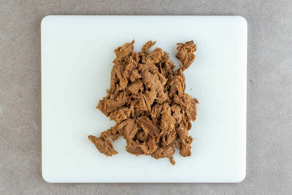 In einem großen Topf ausreichend gesalzenes Wasser für die Pasta zum Kochen bringen. Das vegane Rindergulasch mit den Händen oder einer Gabel zerzupfen, die Gulaschsauce aufbewahren.