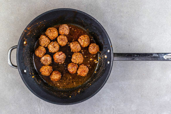 Die Fleischbällchen in zwei großen Pfannen mit je 2EL Olivenöl bei mittlerer bis starker Hitze rundum ca. 2Min. goldbraun anbraten. Den Knoblauch und die restliche Gewürzmischung unterrühren und ca. 1Min. mitbraten.