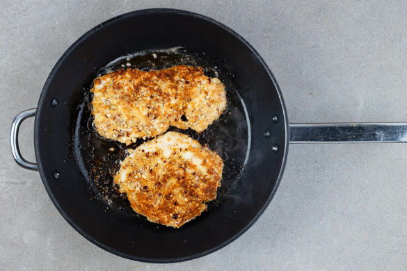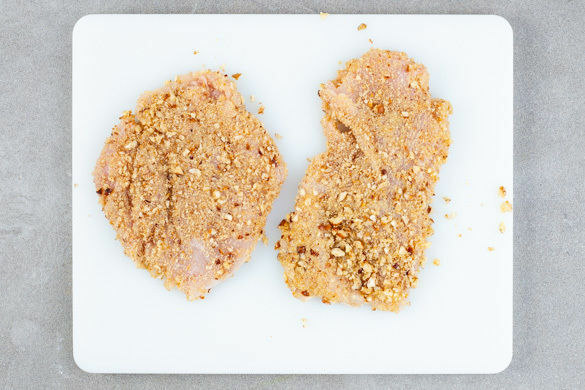 Das Fleisch trocken tupfen und horizontal halbieren. Zwischen zwei Lagen Frischhaltefolie mit einem Fleischklopfer oder dem Boden einer schweren Pfanne flach klopfen und nacheinander in 2EL Mehl, 1 verquirltem Ei und der Nussmischung panieren.
