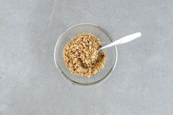 Die Haselnüsse fein hacken und mit der ½ der Semmelbrösel sowie 1EL Olivenöl vermengen. Mit Salz und Pfeffer würzen.