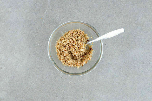 Die Haselnüsse fein hacken und mit den Semmelbröseln sowie 2EL Olivenöl vermengen. Mit Salz und Pfeffer würzen.