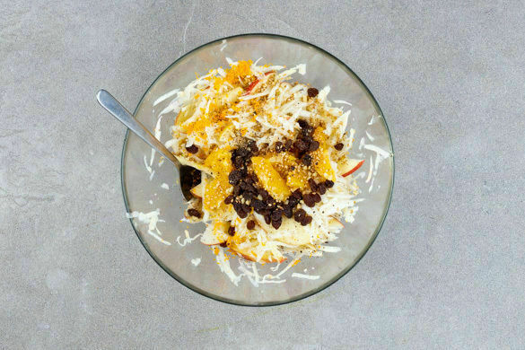 Die Sellerie-Apfel-Mischung mit den Orangenfilets, dem Orangensaft, der Orangenschale, den Rosinen und der Gewürzmischung vermengen. Mit 1EL Olivenöl sowie Salz und Pfeffer abschmecken.