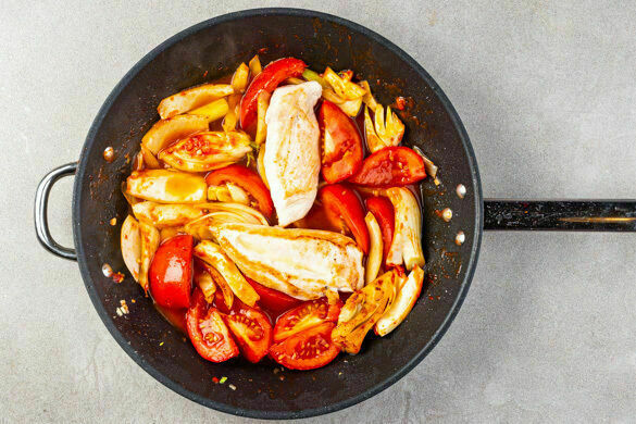 Heute können wir es kaum erwarten, in unsere Küchenschürze zu schlüpfen. Denn wir servieren saftig-zartes, in feinster Tomaten-Fenchel-Sauce gedämpftes Bio-Hähnchenfilet mit knusprigen Pankokrumen auf al dente gekochter Penne. Die zylinderartige Form der Pasta nimmt die aromatische, mit Fischsauce und Knoblauch gewürzte Sauce übrigens besonders gut auf. So wird jede Gabel zum vollen Genuss – Bonus!