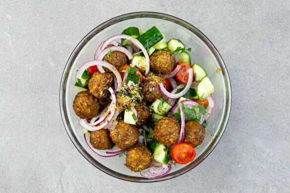 Liebe geht durch den Magen: Und wir lieben einfach diesen leckeren libanesischen Brotsalat, auch Fattoush genannt, mit Pita-Croûtons, Kirschtomaten, Gurke und frischen Kräutern. Den machen wir heute mit besonders viel Liebe, einem herrlich zitronigen Za’atar-Dressing und einer Extraportion Falafeln obendrauf. Muss man einfach mal erlebt haben!