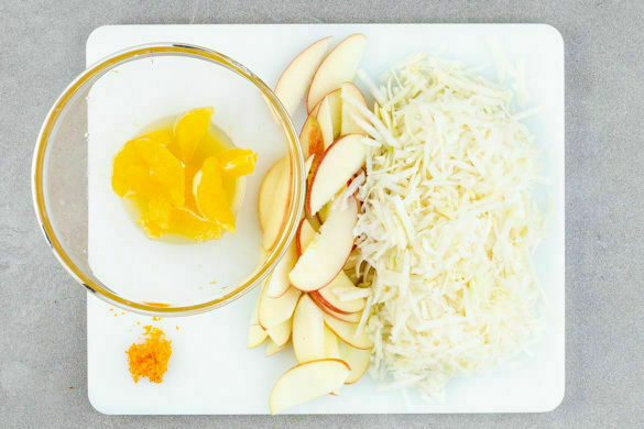 Ca. 2TL Orangenschale abreiben, dann die Orangen rundherum schälen und in mundgerechte Stücke schneiden, dabei den Saft auffangen. Die Äpfel vierteln, entkernen und in dünne Scheiben schneiden. Den Sellerie vierteln, schälen und fein raspeln oder in feine Stifte schneiden. Mit den Äpfeln, 1 kräftigen Prise Salz und 1EL Essig vermengen, beiseitestellen und ziehen lassen.