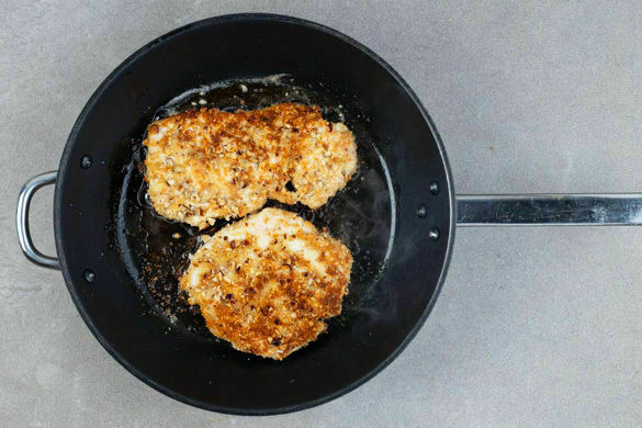 Das Fleisch trocken tupfen und jeweils horizontal halbieren. Zwischen zwei Lagen Frischhaltefolie mit einem Fleischklopfer oder dem Boden einer schweren Pfanne flach klopfen und nacheinander in 4EL Mehl, 1 verquirltem Ei und der Nussmischung panieren.