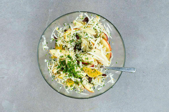 Die Sellerie-Apfel-Mischung mit den Orangenfilets, dem Orangensaft, der Orangenschale, den Rosinen und der Gewürzmischung vermengen. Mit 1EL Olivenöl sowie Salz und Pfeffer abschmecken.