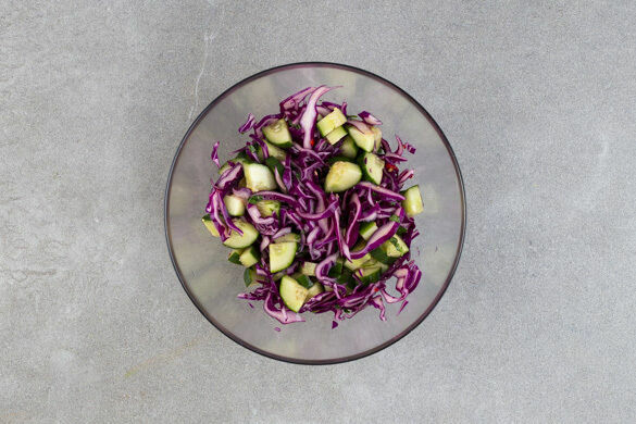 Den Rotkohl in feine Streifen schneiden. Die Gurke würfeln und mit dem Rotkohl, der Chilischote nach Geschmack sowie dem Dressing zu einem Salat vermengen.