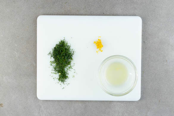 Den Dill samt Stängeln fein schneiden. 1TL Zitronenschale abreiben, dann die Zitrone halbieren und eine Hälfte auspressen.