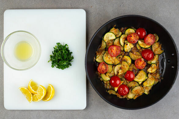 Die Kirschtomaten und die Zucchini in die Pfanne geben und 4–6Min. mitbraten. Die abgeriebene Zitrone halbieren und auspressen, die andere Zitrone in Spalten schneiden. Die Petersilie grob schneiden. Das Gemüse in der Pfanne mit 4EL Essig ablöschen und noch kurz köcheln lassen, bis der Großteil der Flüssigkeit verdampft ist, dann mit Salz und Pfeffer abschmecken.