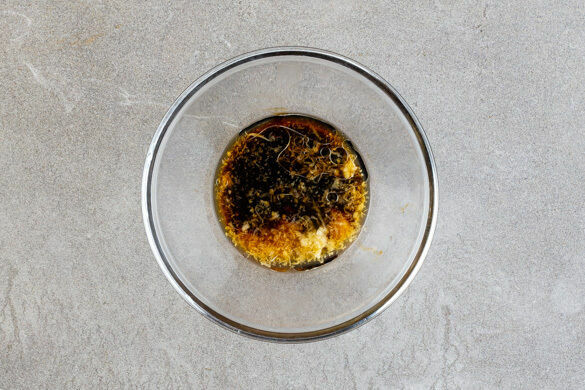 Die Teriyakisauce mit dem Ingwer, dem Knoblauch, 2EL Pflanzenöl, 2EL hellem Essig sowie je 1 kräftigen Prise Salz und Pfeffer verrühren.