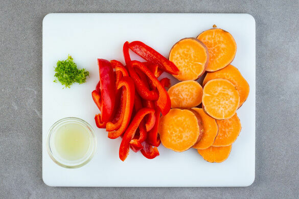 Den Backofen auf 240°C (220°C Umluft) vorheizen. Die Süßkartoffel schälen und in 0,5cm dünne Scheiben schneiden. Die Paprika vierteln, entkernen und in 1–2cm breite Streifen schneiden. Die Limettenschale abreiben, dann die Limette halbieren und auspressen.