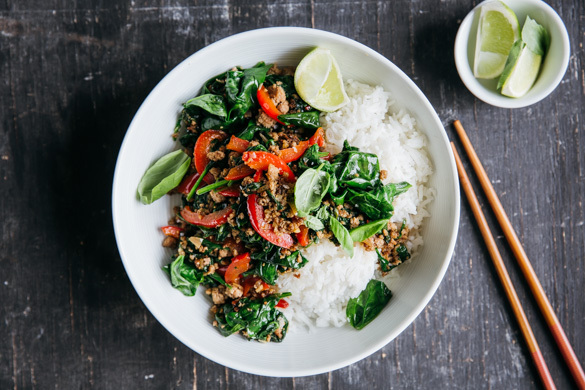 Heute lassen wir die Geschmacksknospen tanzen! Für dieses aromatische Gericht aus der Thai-Küche verzauberst du dein saftiges Rinderhackfleisch mit den köstlichsten Zutaten wie Limette, Sojasauce, Chili und viel Thai-Basilikum. Die rote Paprika sorgt für den Extracrunch und wird umgarnt von zartem Spinat. Beschwer dich nicht, wenn du danach auch noch das Tanzbein schwingen willst!