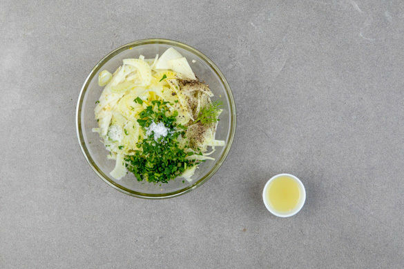 Zwischendurch den grünen Teil der Lauchzwiebel ebenfalls in sehr feine Ringe schneiden. Die Petersilie samt Stängeln fein hacken. Den Schnittlauch in feine Röllchen schneiden.