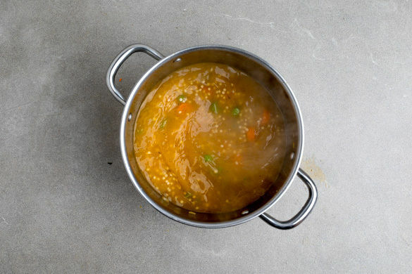 Das Gemüse und den Perlencouscous mit 1L Wasser ablöschen, das Brühgewürz hinzugeben und alles zum Kochen bringen. Bei mittlerer Hitze 5–6Min. köcheln lassen.