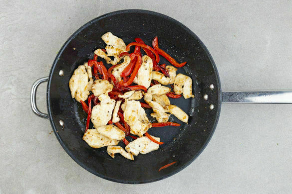 Das Fleisch und die Paprika in einer großen Pfanne mit 2EL Pflanzenöl bei starker Hitze 3–4Min. scharf anbraten. Mit je ½TL Salz und Pfeffer würzen, aus der Pfanne nehmen und beiseitestellen.