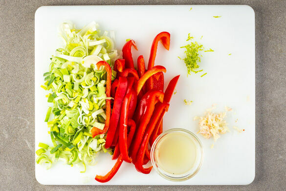 Die Paprika vierteln, entkernen und in dünne Streifen schneiden. Den Lauch jeweils längs halbieren und quer in feine Streifen schneiden. Den Knoblauch schälen und grob würfeln. Die Limettenschalen abreiben, dann die Limetten halbieren und auspressen.
