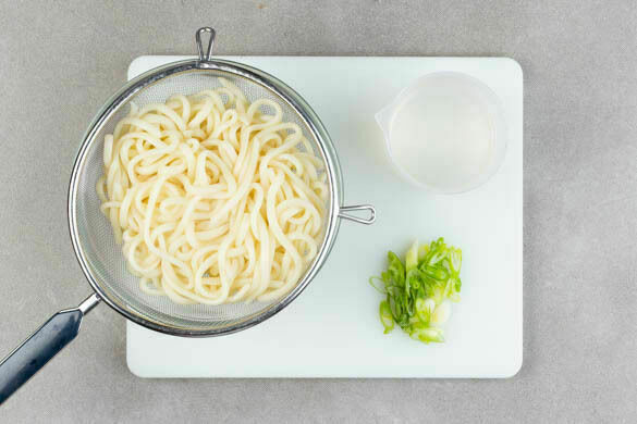 Die Nudeln in das kochende Wasser geben und in 2–3Min. bissfest kochen, dabei zwischendurch umrühren, um die Nudeln voneinander zu trennen. Inzwischen die Lauchzwiebeln in feine Ringe schneiden. Mit einem Messbecher 200ml Nudelwasser abschöpfen, dann die Nudeln in ein Sieb abgießen und kalt abschrecken.
