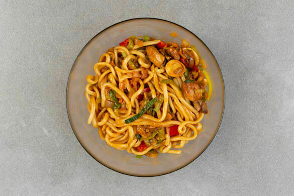Die Nudeln und 100ml Nudelwasser in die Pfanne geben und bei starker Hitze ca. 1Min. vorsichtig mit dem Gemüse und dem Fleisch vermengen.