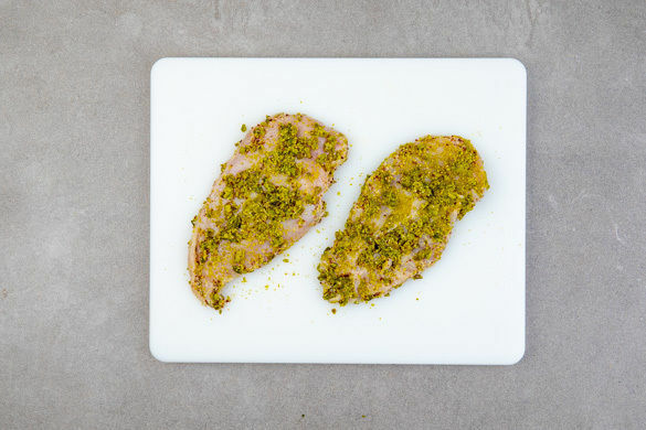 Die Pistazien fein hacken. 4EL körnigen Senf mit 1–2EL Wasser verrühren. Das Fleisch trocken tupfen und jeweils horizontal in 2 dünne Schnitzel schneiden. Erst mit je 1 Prise Salz und Pfeffer würzen, dann mit dem Senf bestreichen und mit den Pistazien panieren. Das Fleisch während der letzten 6–7Min. Garzeit mit zum Blumenkohl in den Ofen geben.
