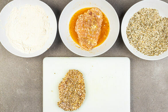 Für die Panade 6EL Mehl auf einen tiefen Teller geben. Auf einem weiteren Teller 1 Ei mit 1EL Wasser und je 1 Prise Salz und Pfeffer verquirlen. Das Panko-Paniermehl mit 1TL Oregano und je 1 Prise Salz und Pfeffer auf einem dritten Teller vermengen. Das Fleisch nacheinander erst im Mehl, dann im Ei und zum Schluss im Panko-Paniermehl wenden.