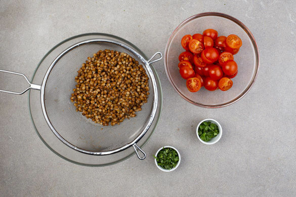 Die Linsen in dem Sieb mit kaltem Wasser abspülen und abtropfen lassen. Die Basilikumblätter von den Stängeln zupfen und ca. ¾ der Blätter fein, die restlichen Basilikumblätter grob schneiden. Die Tomaten halbieren und ca. 5Min. vor Ende der Backzeit zur Roten Bete in den Ofen geben.