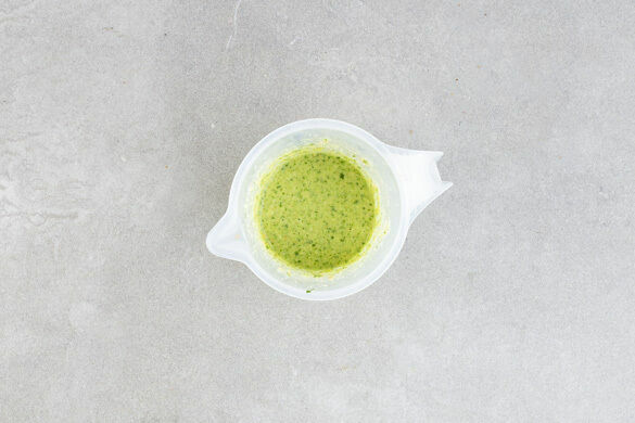 Ca. ⅔ des Korianders mit dem Ingwer, den Erdnüssen, 150ml kaltem Wasser, 2EL Pflanzenöl, 1EL Essig, 1TL Zucker und 1 kräftigen Prise Salz in einem hohen Gefäß möglichst glatt pürieren.