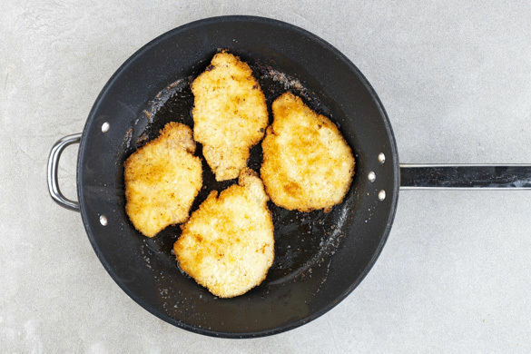 Die Tonkatsu in einer mittelgroßen Pfanne mit 2EL Pflanzenöl bei mittlerer bis starker Hitze auf jeder Seite 2–3Min. knusprig braten.