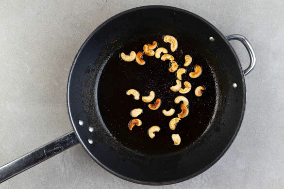 Die Cashews mit der ½ der restlichen Gewürzmischung sowie 2TL Olivenöl vermengen und in der Pfanne bei mittlerer Hitze 1–2Min. erwärmen. Vorsicht, sie können schnell zu dunkel werden. Zum Abkühlen aus der Pfanne nehmen und beiseitestellen.