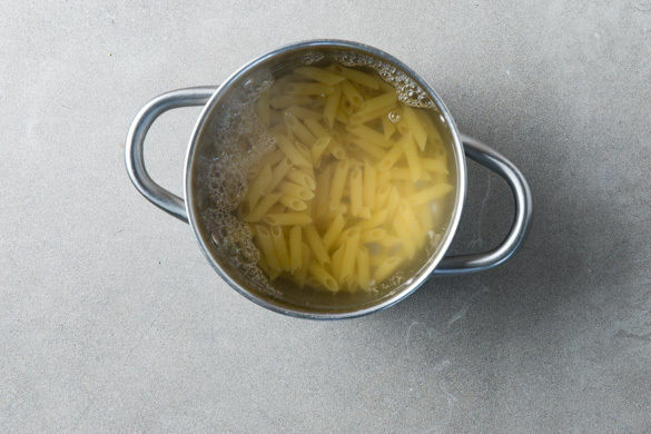 In einem großen Topf ausreichend gesalzenes Wasser für die Pasta zum Kochen bringen. Die Pasta in das kochende Wasser geben und in 7–9Min. bissfest kochen. In ein Sieb abgießen und abtropfen lassen.