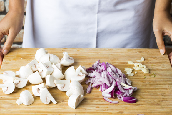 Die Pilze ggf. säubern und vierteln. Die Zwiebel schälen, halbieren und in feine Streifen schneiden. Den Knoblauch schälen und in dünne Scheibchen schneiden.