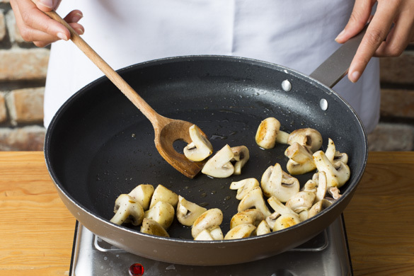 Die Pilze in einer weiteren mittelgroßen Pfanne mit 1EL Olivenöl bei starker Hitze 2–3Min. scharf anbraten. Auf einem Teller beiseitestellen.