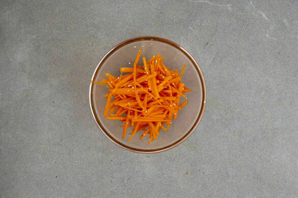 Ca. ⅔ des Sesamöls mit 1TL Sesam, 2EL hellem Essig, ½TL Zucker und je 1 kräftigen Prise Salz und Pfeffer zu einer Marinade verrühren. Die Karotten ggf. schälen und grob reiben oder in sehr feine Stifte schneiden. Die Karotten mit der Marinade vermengen.